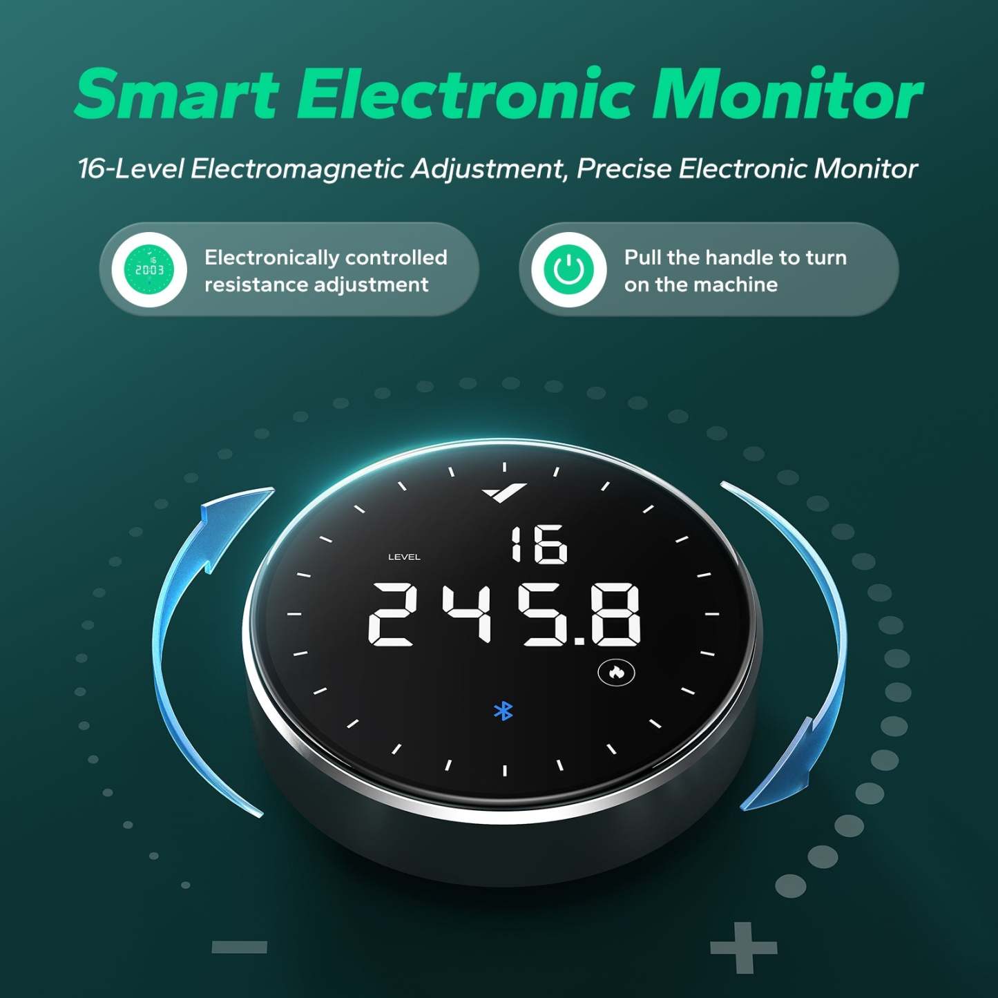 Precisely manage 16 levels of electromagnetic resistance with a simple twist. Pull to start, and enjoy automatic resistance adjustment via the MERACH app, freeing your hands for an uninterrupted workout.