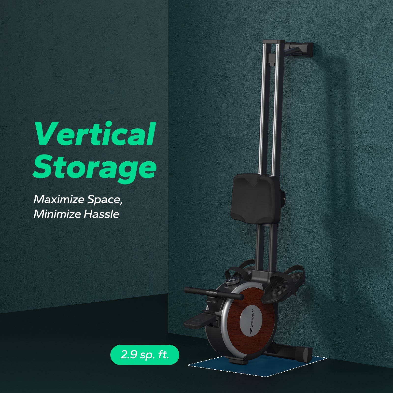 The built-in base wheels make rower simply lift to store upright against a wall, recommended space for use is 1.6*5.7 feet, for storage is 1.6*2.1 feet.